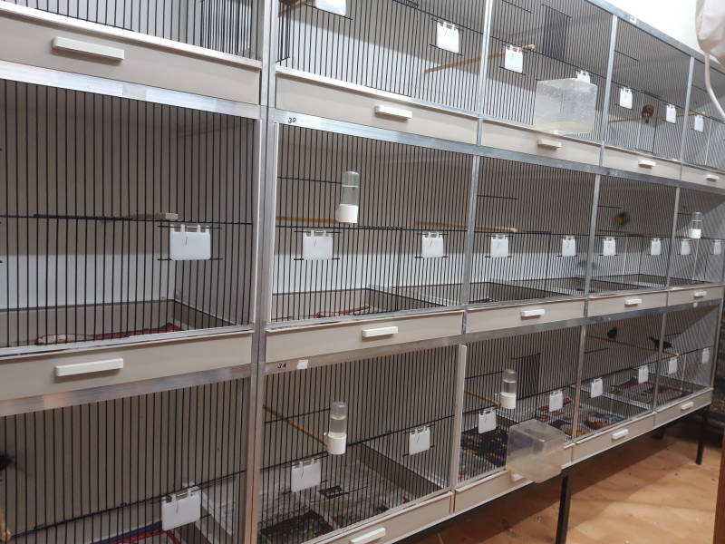 Foto onder: Broed/ kweekkooien hebben enkele grote voordelen. Er is goed overzicht, ze zijn relatief makkelijk schoon te houden en vogels zijn makkelijk apart te zetten als dat nodig is. Nadeel is de relatief beperkte ruimte die (standaard) kweekkooien vaak hebben waardoor de kans op stress vrij groot is. Door kooien te koppelen zoals onder ontstaan geschikte kweekkooien voor tangara's.
